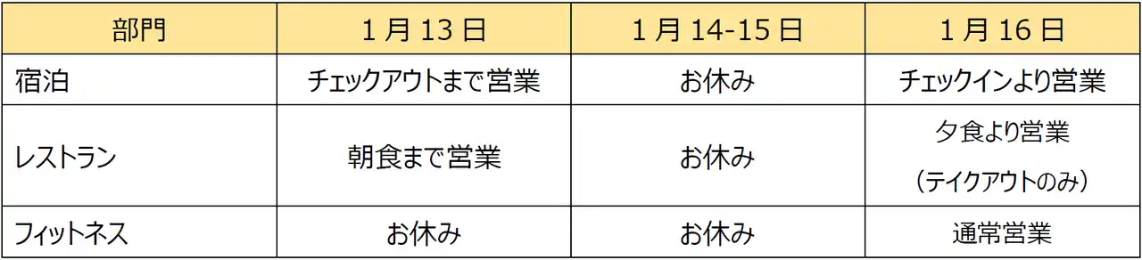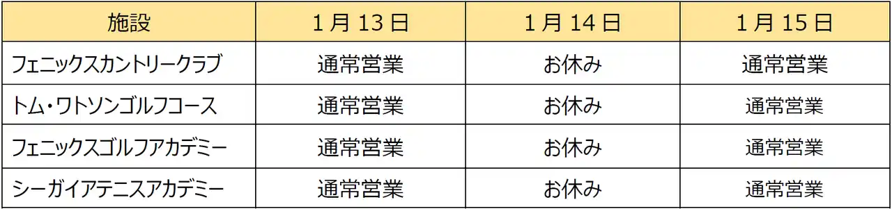 フェニックス・シーガイア・リゾート(フェニックスリゾート株式会社/宮崎市:代表取締役社長 山本俊祐)は、宿泊部門を2026年1月13日(火)~1月15日(木)の3日間、スポーツ部門を同年1月14日(水)の1日間で「全施設一斉休館日」を実施いたします。 |