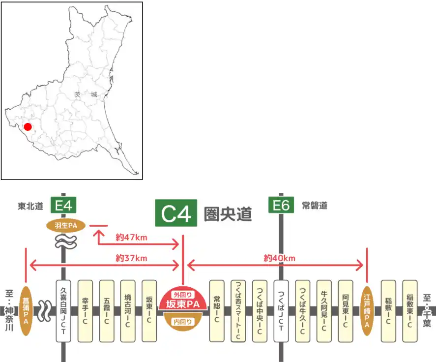 NEXCO東日本(東京都千代田区)は、【C4】首都圏中央連絡自動車道(以下「圏央道」)外回り 坂東インターチェンジ(以下「IC」)~常総IC間に新たに坂東(ばんどう)パーキングエリア(以下「PA」)(茨城県坂東市弓田)をオープンします。 |