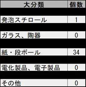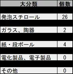 調査区画内で収集されたごみのうち、「プラスチック」類が38個と最も多く、次いで「紙・段ボール」類が多い結果となりました。