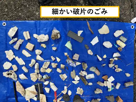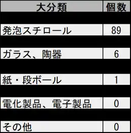 「プラスチック」類のごみは111個と際立って多く、その次に「発泡スチロール」が多い結果となりました。写真から分かるように破片類のごみが多くみられ、プラスチックや発泡スチロールが漂流や経年劣化の過程で微細化した「破片」として大量に打ち上げられていることが分かります。これらは、伊勢湾流域から川を通じて流出したものに加え、伊勢志摩周辺地域で盛んな養殖業で使用されるフロート等が破損・微細化したものも含まれていると推測されます。 |