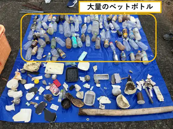 藤前干潟における調査では、他の地点と比較して収集されたごみの総量が格段に多い結果となりました。なかでも特筆すべきは「ペットボトル」の量です。その数は今回の調査地点の中でも群を抜いており、上流からの生活ごみが河口域に集積している実態が浮き彫りとなりました。加えて、原型をとどめたごみだけでなく、プラスチックなどの「破片ごみ」も多くみられ、大小様々な形状のごみが堆積していることが特徴的です。 |