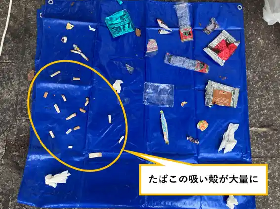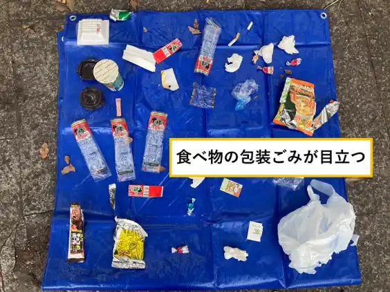 公園周辺にはコンビニエンスストアが多数立地していることから、近隣で購入した食品や飲料が公園のベンチなどで消費され、そのごみがそのまま放置されていると推測されます。実際、ベンチ周辺には飲食後のごみが散乱している状況が見受けられました。さらに他では見られなかった点として、プラスチック類の内訳をみると、その大部分にあたる34個が「食品の包装容器」であったことと「たばこの吸い殻」が大量に落ちていたことが挙げられます。「たばこの吸い殻」については、分類表に項目がありませんでしたが、収集量が多かったため、特記しました。吸い殻はベンチ周辺に集中しており、その場所が喫煙場所として利用されている実態がうかがえます。 |