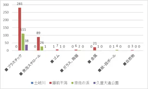 3. ごみの流れと形状の変化:上流部と位置づけた土岐川ではごみの絶対量が少なく傾向がつかみにくかったものの、図2<ごみの内訳>から分かるように、市街地では投棄されて間もない原形をとどめた食品の包装容器などの生活ごみが多く見られました。 一方、河口域にあたる藤前干潟ではペットボトルや比較的形状の残った食品容器類が多く、漂着海岸である奈佐の浜では、長距離の漂流や波の影響で細かく砕けた破片類が多く確認されました。このことから、ごみは上流から移動する過程で形状を変えていき、各エリアで確認されるごみには、その段階ごとの特徴が顕著に表れていることが分かりました。 |