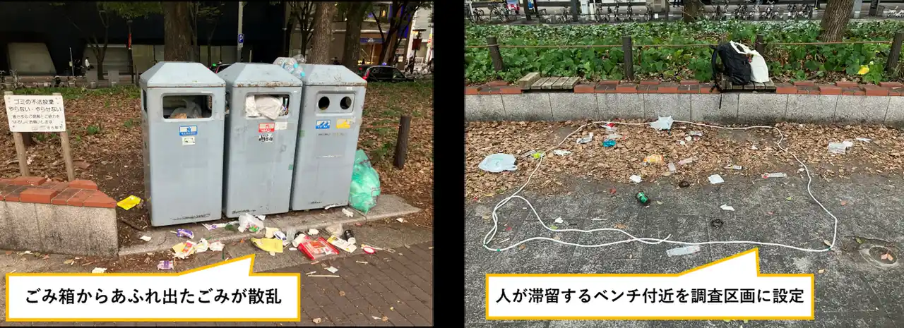 名古屋市中区栄に位置する久屋大通公園は、都市の中心部を南北約2kmにわたって貫く大規模な公園です。この公園は、戦後の都市計画の一環として名古屋のメインストリートである「100m道路」の中央帯を利用して整備され、「日本の歴史公園100選」にも選ばれています。しかし、公園内ではごみが散乱している現状が見受けられました。写真の通り、ごみ箱からあふれ出たごみがそのまま無造作に放置されている状態です。今回の調査では、特に人が留まりやすいベンチ付近に調査区画を設定し、ごみの種類を記録しました。 |