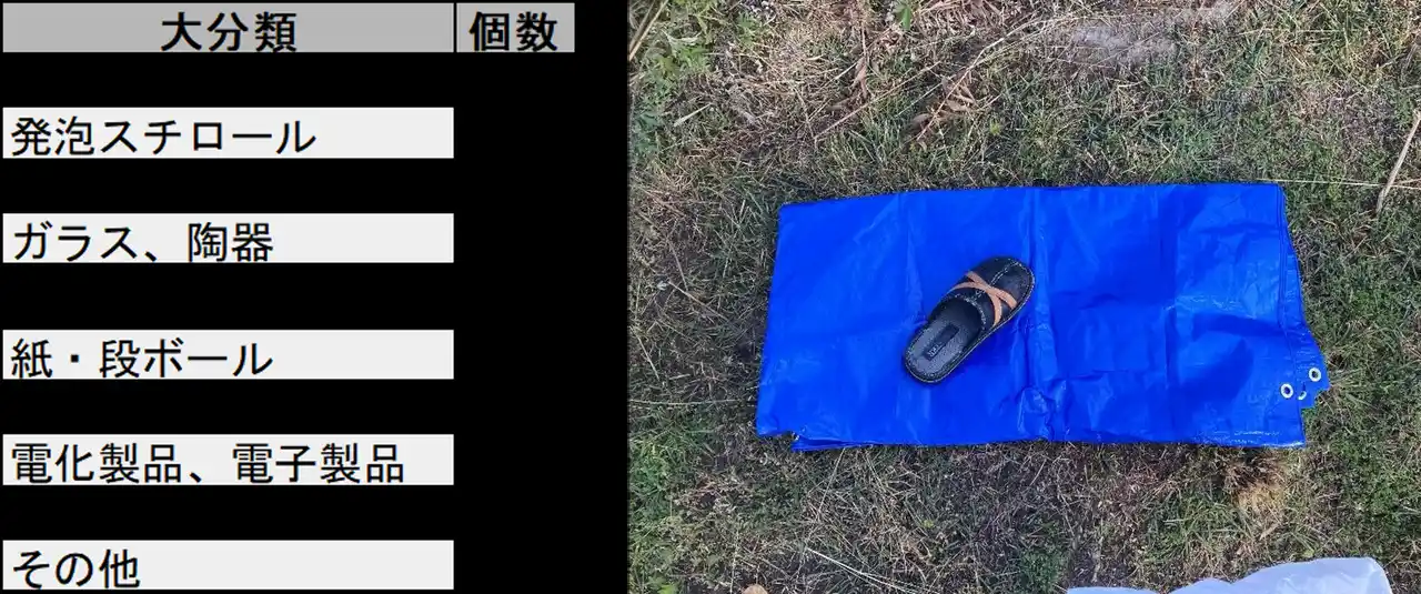 活動場所に2m四方の調査区画をロープで設定し、その区画内にあったごみをすべて収集します。収集したごみは、環境省が作成した「地方公共団体向け漂着ごみ組成調査ガイドライン」(令和7年度5月第4版)に掲載されている分類表に基づき、プラスチック・ゴム・ガラス等の12種類の大分類に分け、それぞれの個数を集計しました。 |