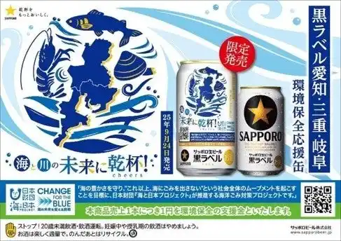 本活動では、海と川の環境を守るための取り組みとして、サッポロビール株式会社とコラボレーションし、「愛三岐 海と川環境保全応援缶」を用いて情報発信も行いました。本商品は売上1本につき1円が環境保全の支援金として寄付されます。また、パッケージに記載された二次元コードからは、プロジェクトの詳細を確認することができます。 |