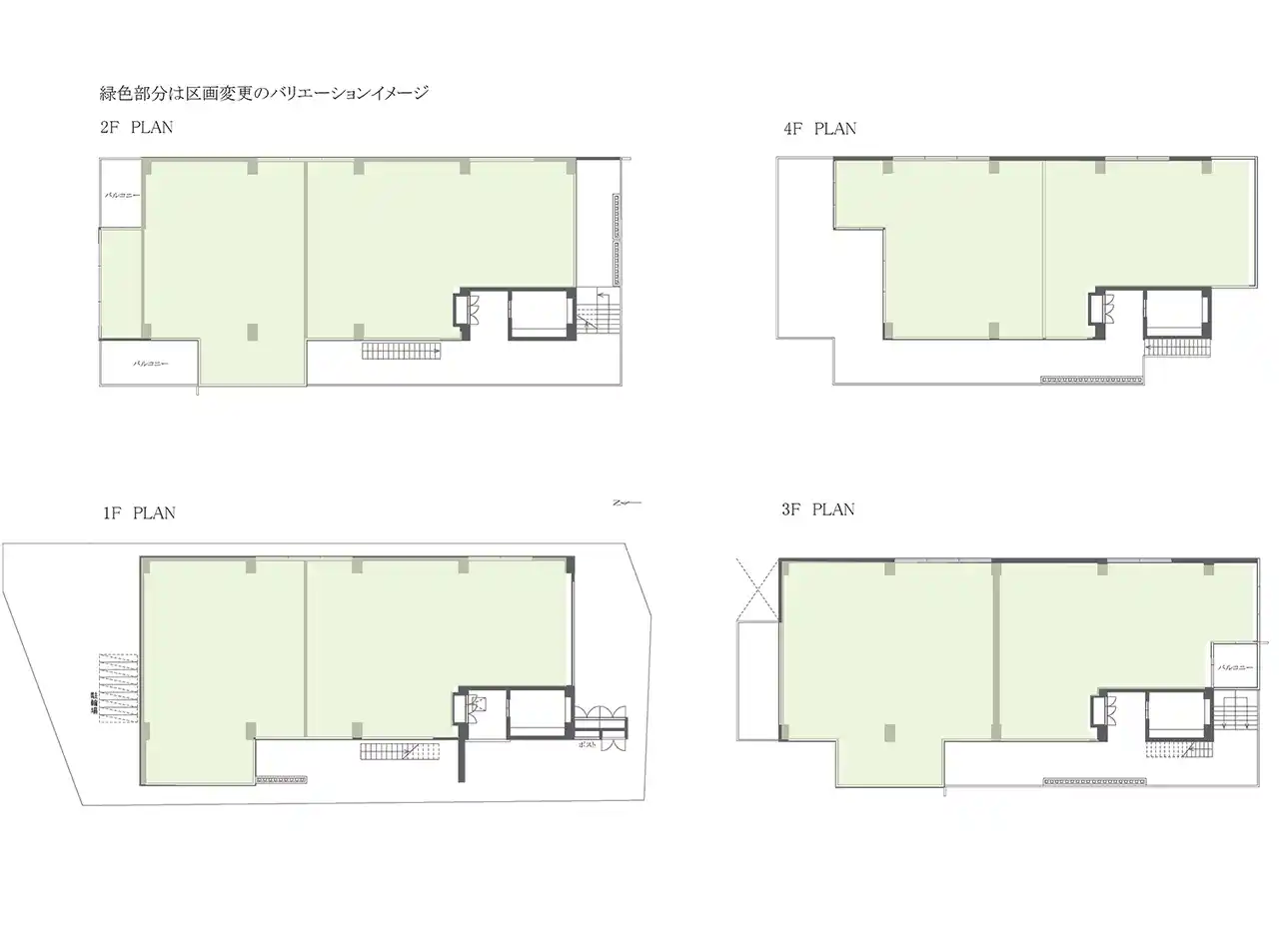 建築が長期的な需要に、柔軟に対応しながら継続していくためにも、社会情勢による用途転用がしやすい状態をつくり、地域や次世代に寄与していくことを目指しています。区画変更をしやすくするため、1フロア2区画のシンプルなフレームとし、界壁は非構造壁とすることで隣接区画の一体利用も想定しています。 |