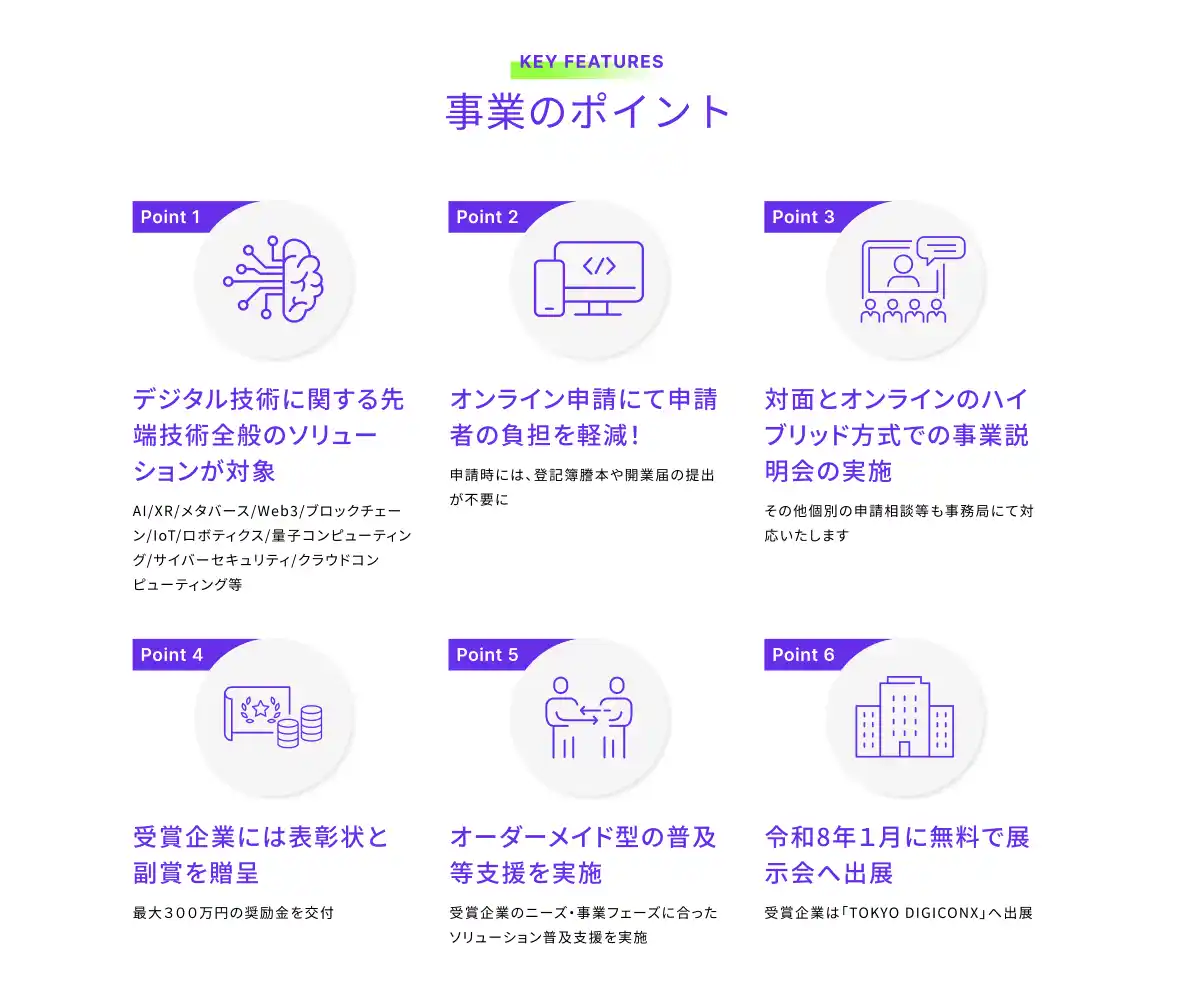 ・「TOKYO DIGICONX(第3回TOKYO XR・メタバース&コンテンツビジネスワールド )」への無料出展 ・事業HP等での広報支援 |