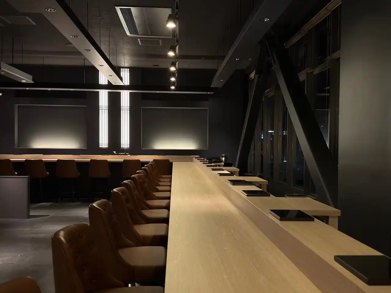 店内は、シックなデザインで高級感あふれる空間設計。6階からの景色が一望できるよう、窓際に大きな寿司カウンターを設けております。 |