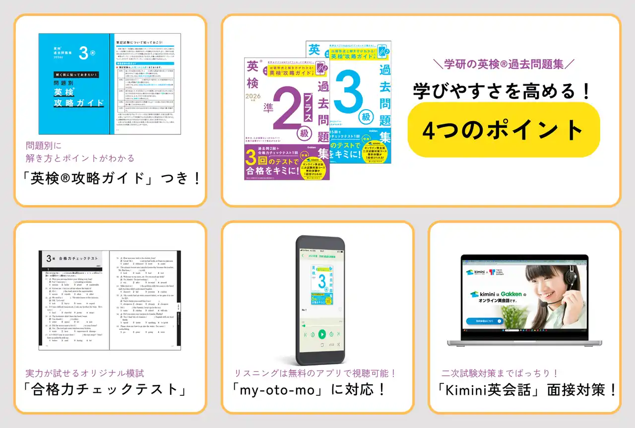 英検攻略ガイド・過去問・オリジナル模試・音声アプリ対応で学びやすさアップ。「Kimini英会話」による二次試験対策もできて、合格まで一貫サポート!