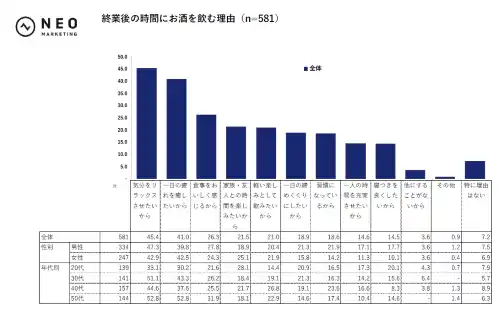 ・終業後の時間にお酒を飲む理由は、「気分をリラックスさせたいから」(45.4%)、「一日の疲れを癒したいから」(41.0%)が2大トップ。