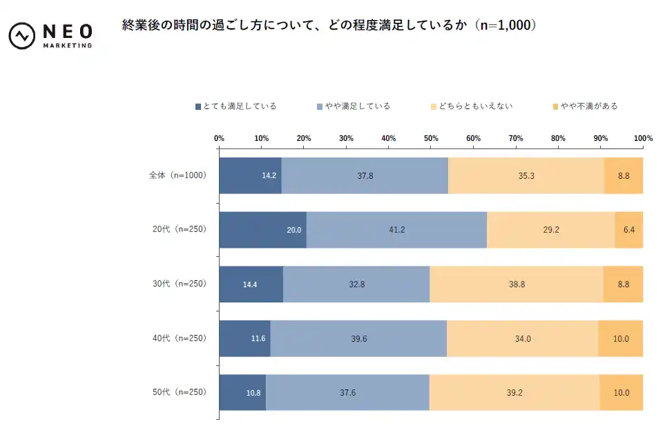 ・終業後の時間の過ごし方満足度は「とても満足している・やや満足している」が全体の52.0%。