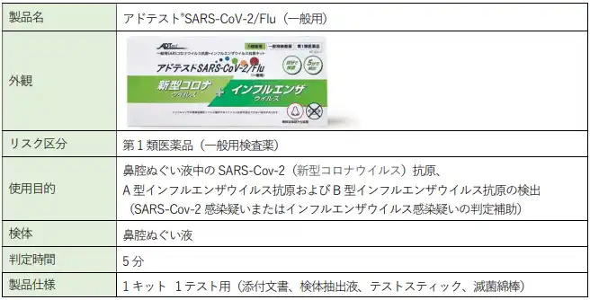 | 本契約に基づき、ウェルネス・コミュニケーションズが提携する医療機関や企業のお客様に、シオノギヘルスケアが販売する新型コロナウイルスおよびインフルエンザ(A型・B型)感染症の一般用検査薬「アドテスト(R) SARS-CoV-2/Flu(一般用)」(以下:本検査薬)をご案内していきます。 | |||