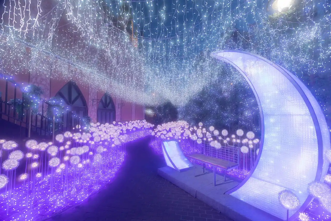 宮の森フランセス教会は、普段は結婚式で訪れる新郎新婦とゲストのための結婚式場です。冬季は地域の皆様にお楽しみいただけるよう「幸せを願う」をテーマに、大聖堂の外壁と中庭をライトアップし、毎年無料で一般開放しています。光に包まれるガーデンや「月」をモチーフにしたフォトスポットは「冬のフォトウェディング・前撮りのロケーション」としても人気で、毎年カップルやファミリーでにぎわいます。 |