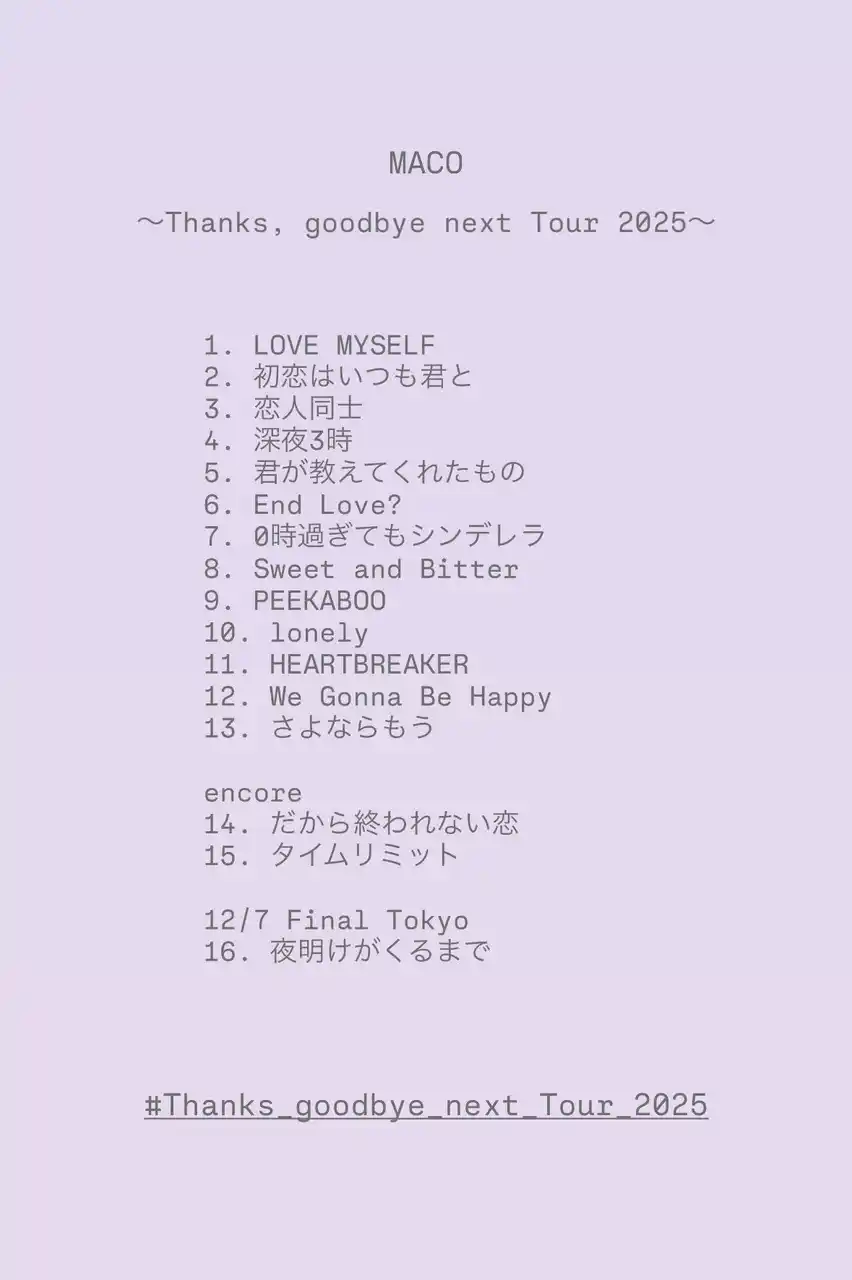 かつては「自分の歌を聴いて、みんなにも恋愛したくなってほしい」と思っていたMACO。しかし現在は、「音楽って耳に響いて、心にも響いて、鼓膜にも響いて「いい音楽だな」って思うのが入口だなって思ったりする」なんて口にする。今回の『Thanks, goodbye next』は、MACOが「リスナーに恋愛したくなってほしい」と願っていた自分に感謝を伝えると共に、次のフェーズに進んでいくための一歩を踏み出したような公演だった。 |