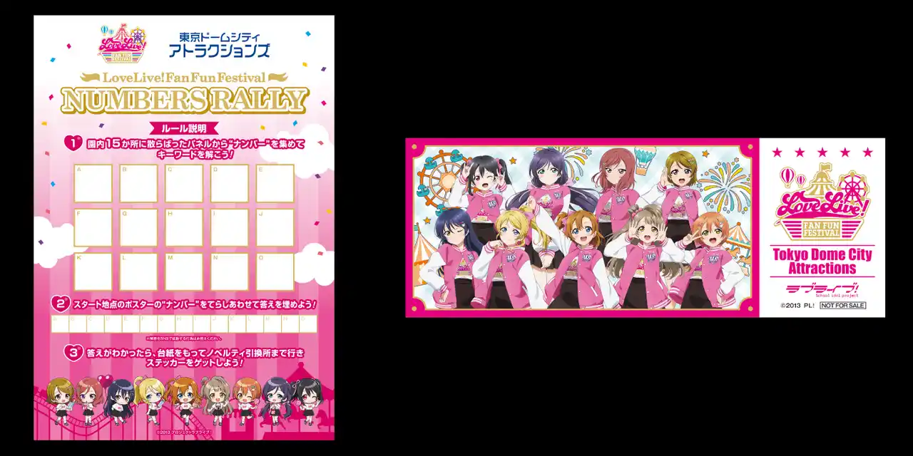 ※ノベルティ:チケット風カード、ナンバーズラリーシート、ミニゲーム~ファンフェスガラポン~参加権。ナンバーズラリーは、遊園地内15か所に散らばった“ナンバー”を集め、キーワードを完成させるラリーです。 |