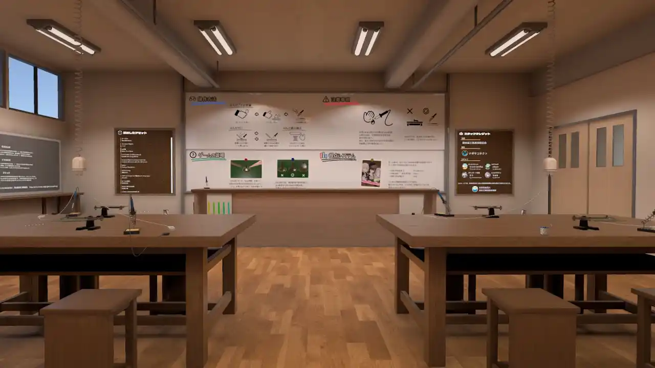 内装は学校の工作技術室をイメージしており、教室のような空間に2つの作業机が並んでいます。各机の上には、はんだごてと電子基板がセットされ、現実の実習風景をそのままメタバースに持ち込んだような空間になっています。ワールドは以下の通り。 |