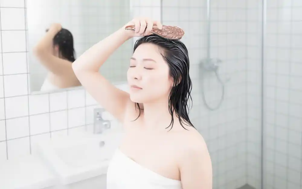 シャンプー前のブラッシングでホコリや汚れを浮かせ、髪のもつれを軽くほどいておくとシャンプーの泡立ちが良くなり、摩擦を軽減できます。シャンプー後は手でざっくりと髪にトリートメントをなじませ、ブラシで全体に行きわたらせるようにゆっくり毛先に向けてブラッシングしてください。濡れた髪はキューティクルが傷つきやすいので、やさしく扱うことが大切です。 |