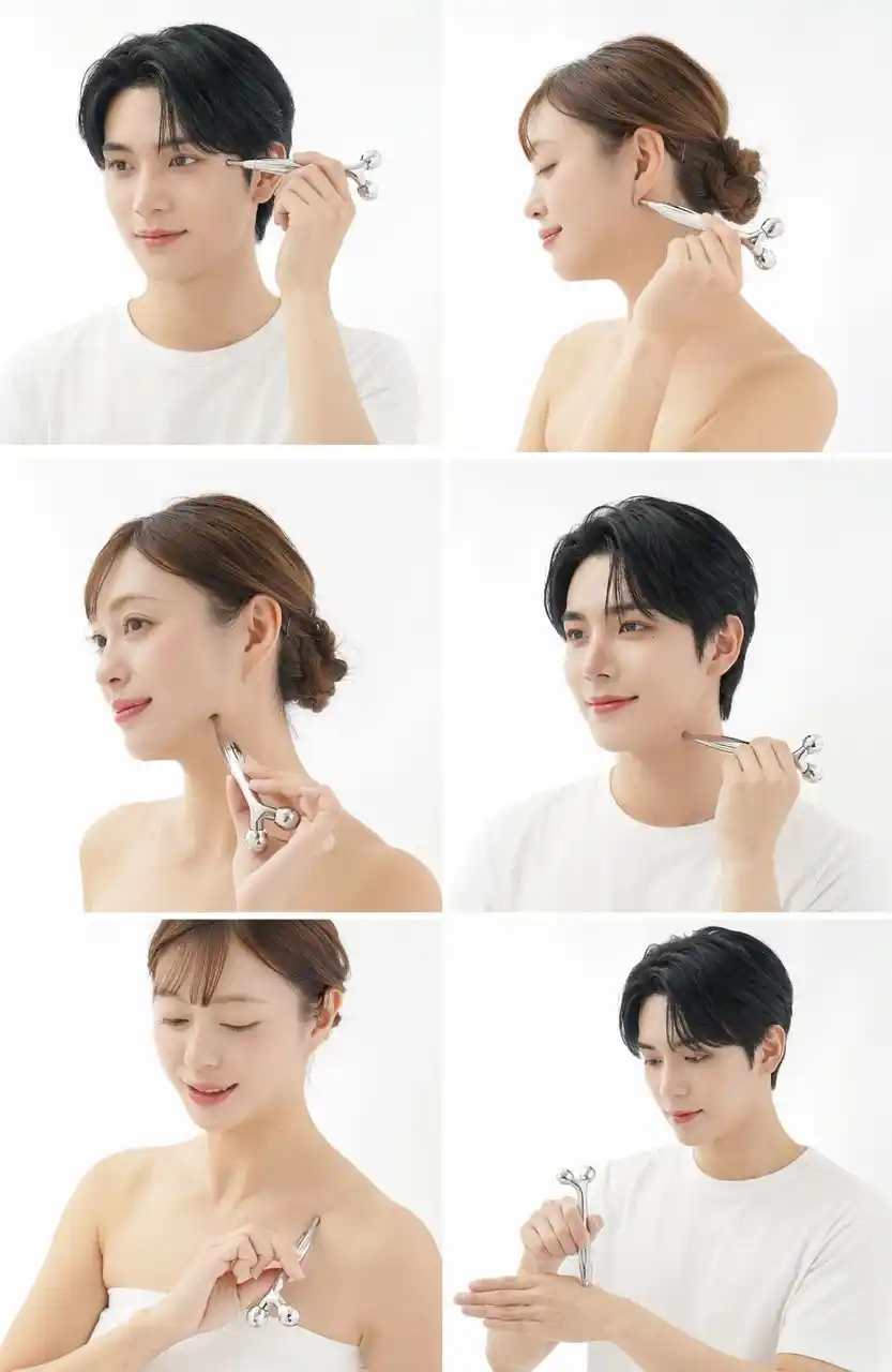 1. 下から上に向かって、やさしく転がす 2. 気になる箇所はゆっくり往復 3. 首筋やデコルテは、中心から外側に向けて流すように |