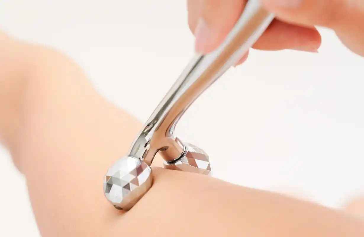 ・POINT 1:3Dローラーヘッドは、肌をつまみながら、肌の表面を滑らせるように流します。 |