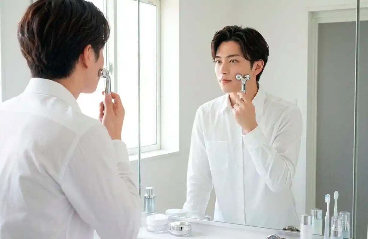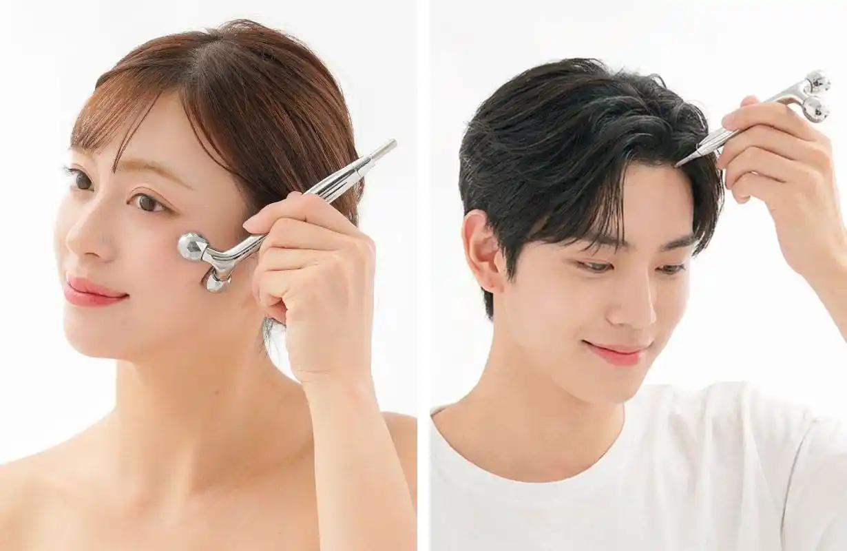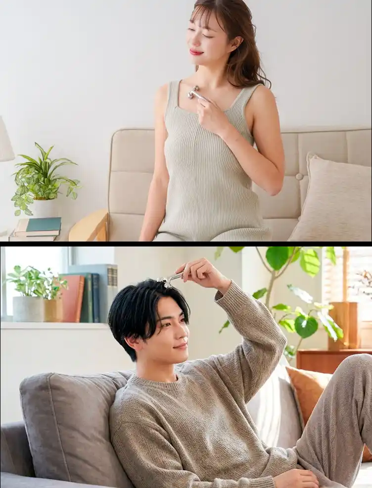 そこで開発したのが、3Dローラー × ポイントスティックのハイブリッド構造。フェイスケアは「つまんで動かす」3Dローラー、コリの集中ケアは「押してほぐす」ポイントスティック この2つの機能を1本に集約することで、「1日数分のセルフケア」が実現しました。 |