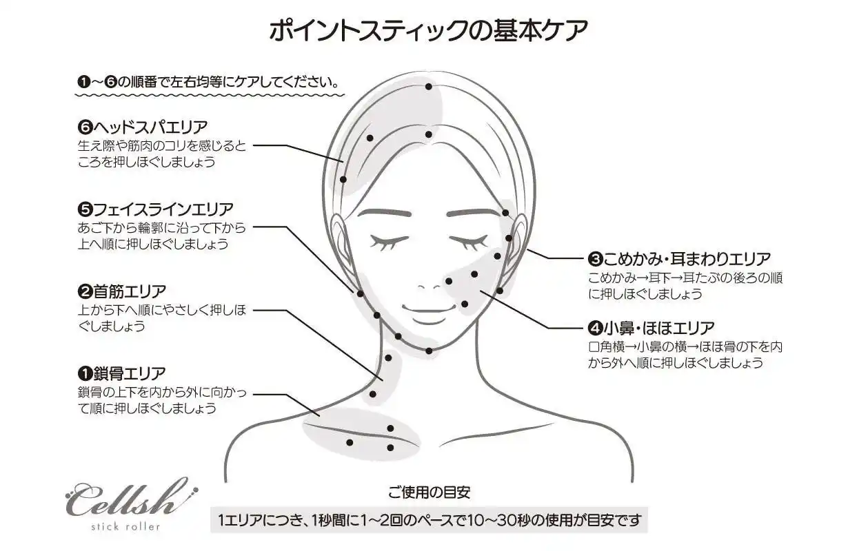1エリアにつき、10~30秒ほどを目安に、心地よい範囲でお使いください。 |