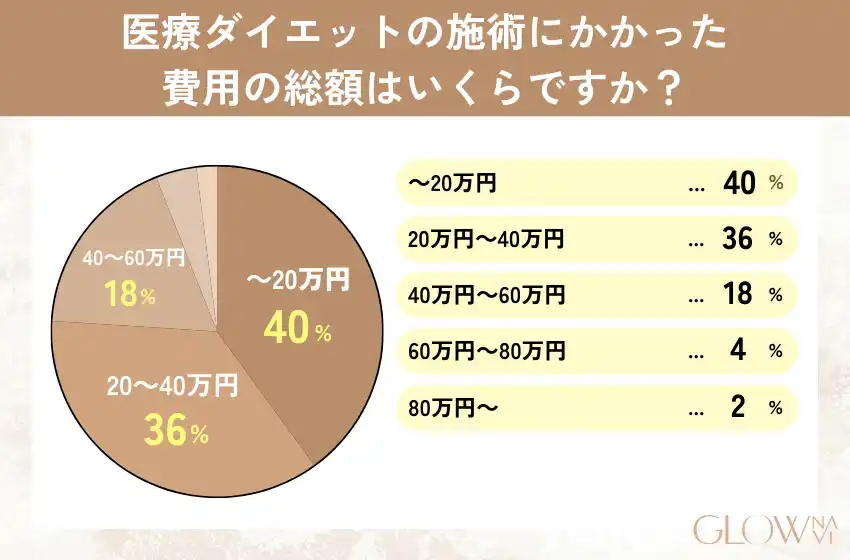 医療ダイエットに使った総額が20万円以内と回答した人は、全体の4割でした。 選ぶプランによって費用は大きく変動するため、目的に合うメニューかどうかを事前に確認しておくことが重要です。 |