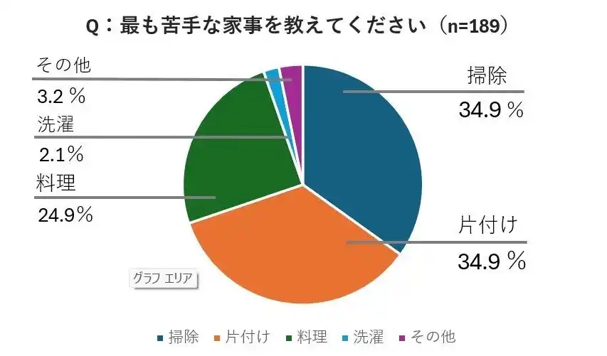 掃除:34.9%(66人) 片付け:34.9%(66人) 料理:24.9%(47人) 洗濯:2.1%(4人) その他:3.2%(6人) |