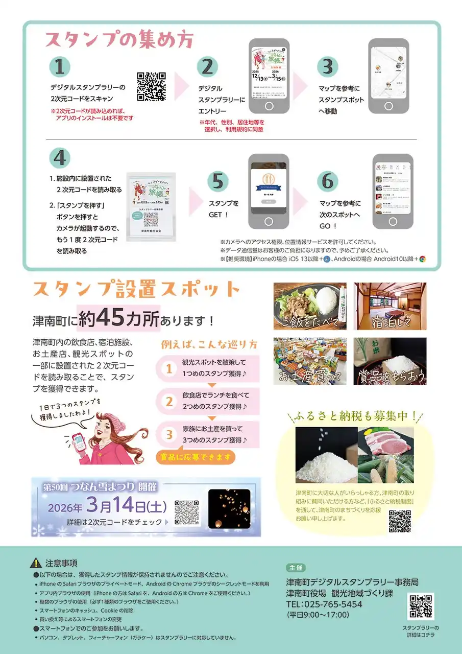 新潟県津南町では、町内の商業施設の周遊促進を目的としたデジタルスタンプラリー 「ぐるっとスタンプまちめぐり つなんの旅帳(冬編)」を開催いたします。こちらの企画は2025年秋の開催に続く第2弾となり、冬編の開催期間は2025年12月13日(土)から2026年3月15日(日)まで。2026年3月14日(土)開催の「つなん雪まつり」の会場もスタンプ設置場所の1つとなります。 |