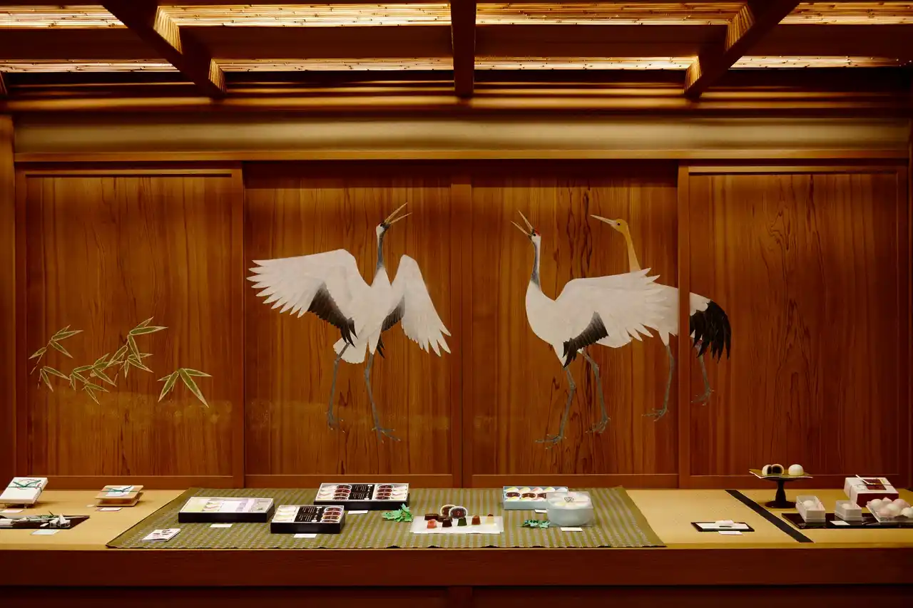 鶴屋吉信本店・1階奥の杉戸絵に描かれた「丹頂鶴」の絵をあしらったデザインです。こちらは1992年に現在の本店建物が竣工した際、これを記念して日本画家・上村淳之画伯に特別にご制作いただきました、本店を象徴する作品でございます。 |