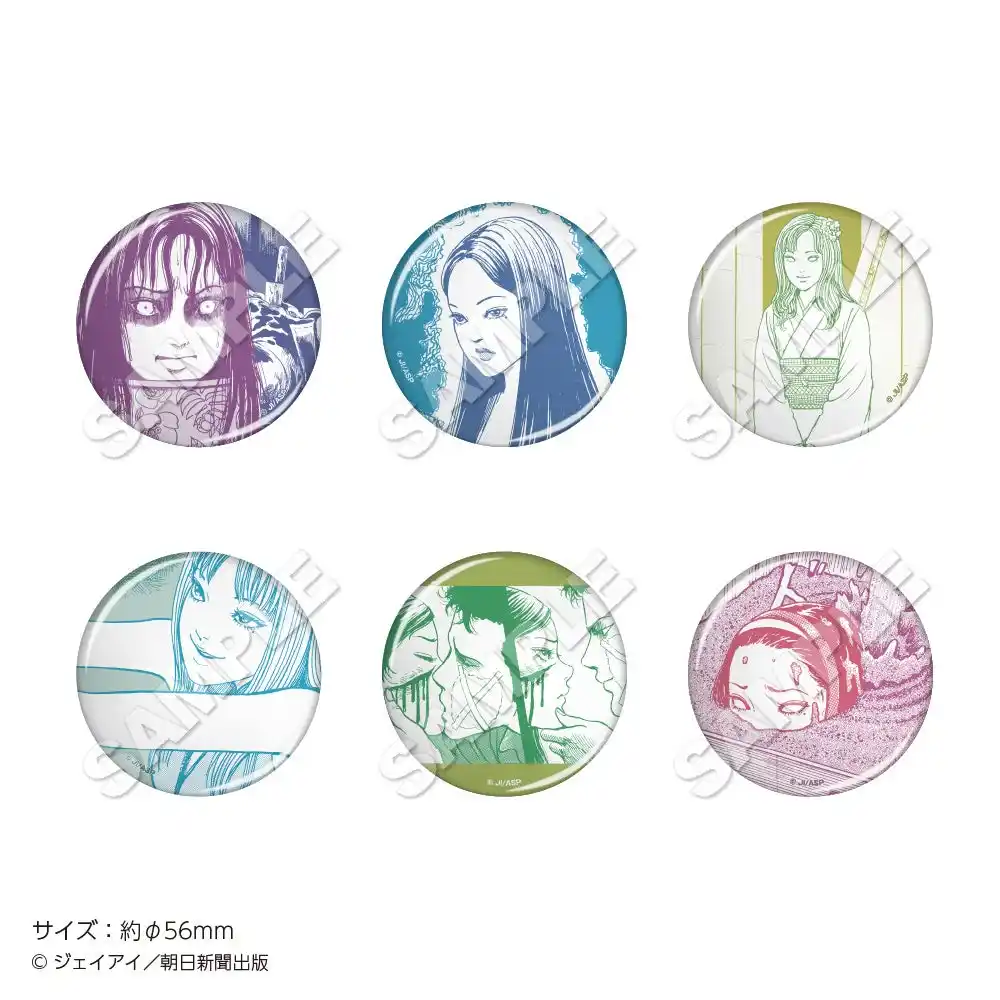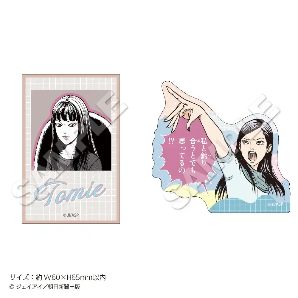 チケットホルダー、トレーディング缶バッジvol.1(全6種)・vol.2(全6種)、ラメアクリルアートボード、トレーディングポストカード(全10種)、ポストカードホルダー、缶ミラー(全3種)、三人の富江アクリルキーホルダー(全3種)、自ら増殖をはじめる富江巾着、自ら増殖をはじめる富江ブロックメモ、ステッカーセット(2枚入り)、クリアしおりセット、パネルガチャ(ミニアクリルチャーム全10種) |
