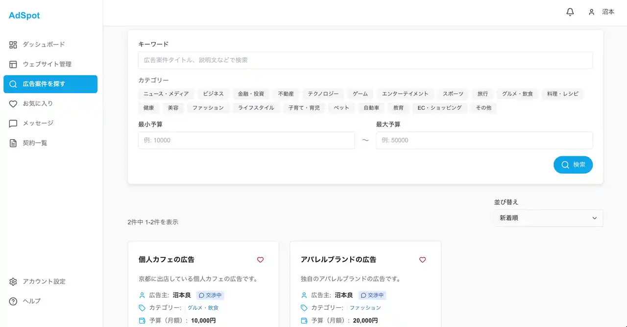 | 株式会社クラフトテック(所在地:京都府京都市右京区、代表:沼本良)は、ウェブサイトの広告スペースを貸したいサイト運営者と、広告を掲載したい広告主を直接つなぐマッチングプラットフォーム「AdSpot(アドスポット)」を2025年12月14日より正式リリースいたします。 | ||||||||||