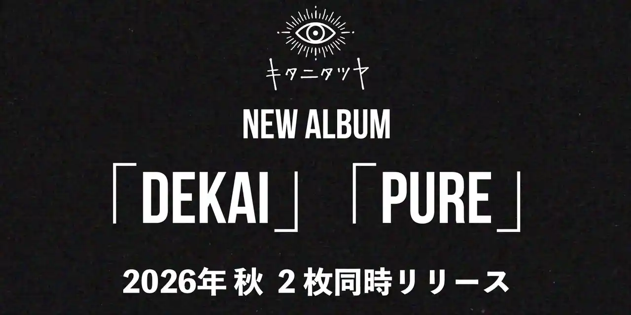 キタニタツヤが、2026年7月に自主企画の対バンライブ“Hugs Vol.6"を開催すること、秋にNew Album「DEKAI」、「PURE」を2枚同時にリリースすることを発表した。 |