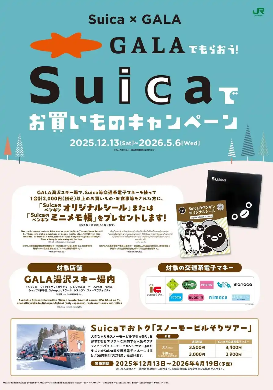 GALA湯沢スキー場の対象店舗で、Suica等交通系電子マネーを使って1会計2,000円(税込)以上のお買いもの・お食事等をされた方に、「Suicaのペンギン オリジナルシール」または「Suicaのペンギン ミニメモ帳」をプレゼントします。 |
