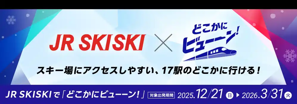 「どこかにビューーン!」の特別企画として、「JR SKISKIで『どこかにビューーン!』」を実施します。期間限定で、行き先候補をスキー場にアクセスしやすい17駅に限定してご利用いただけます。 |