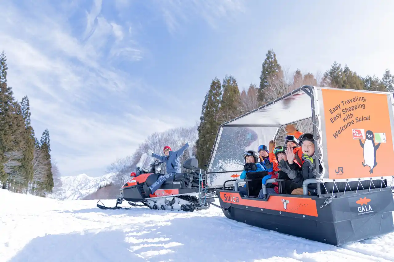 大きなそりをスノーモービルで引っ張り、お客さまを北エリアへご案内する人気アクティビティ「スノーモービルそりツアー」のお支払いにSuica等交通系電子マネーがご利用いただけます。 |