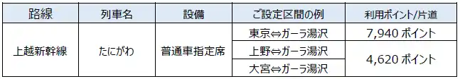 貯まったJRE POINTを「新幹線eチケット(JRE POINT特典)」に交換することができます。 ガーラ湯沢駅発着の新幹線でもご利用可能です。 |