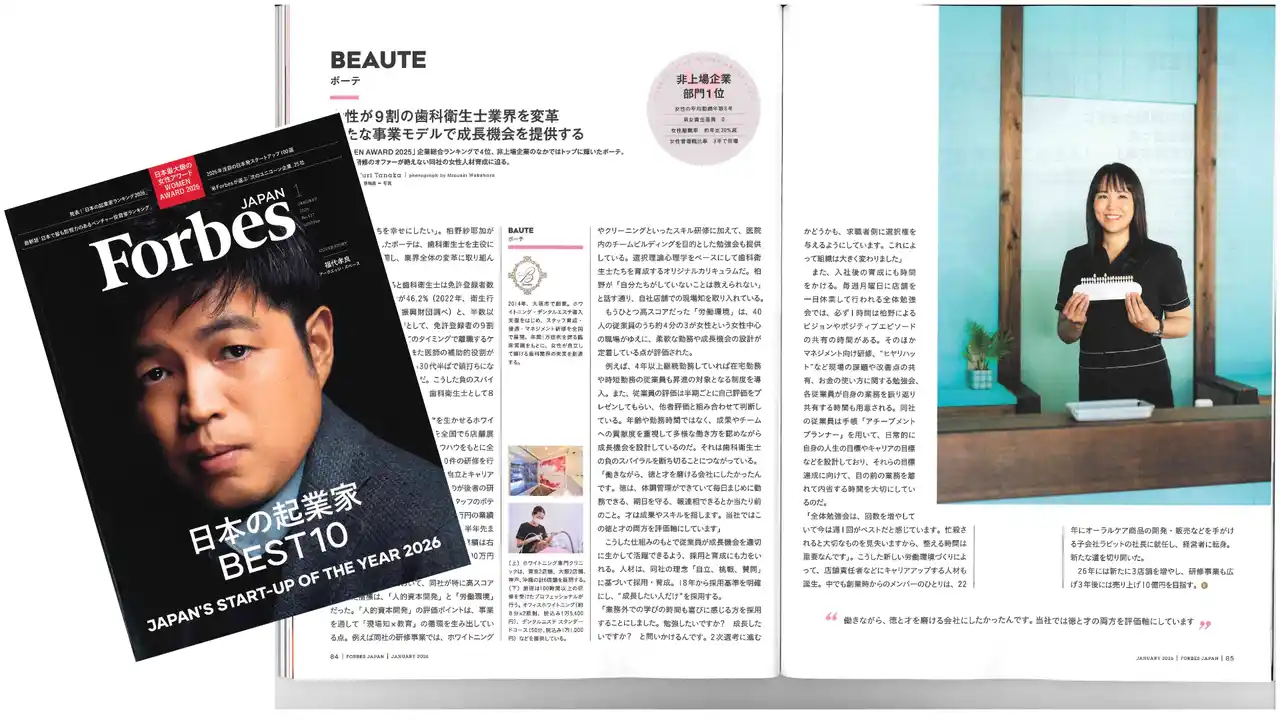 | 代表の柏野紗耶加は、歯科衛生士から経営者として業界を牽引し、「Forbes JAPAN WOMEN AWARD 2025」企業部門第4位を受賞。独自の「美容入りの健康着地」というコンセプトのもと、「スタッフが育つ仕組み」によりホワイトニング・デンタルエステでリピート率9割超・売上1.5倍を実現した実績があります。 | |||