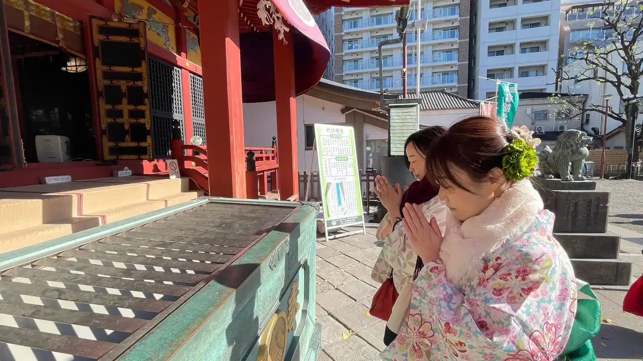 神社でのお参りの様子 |