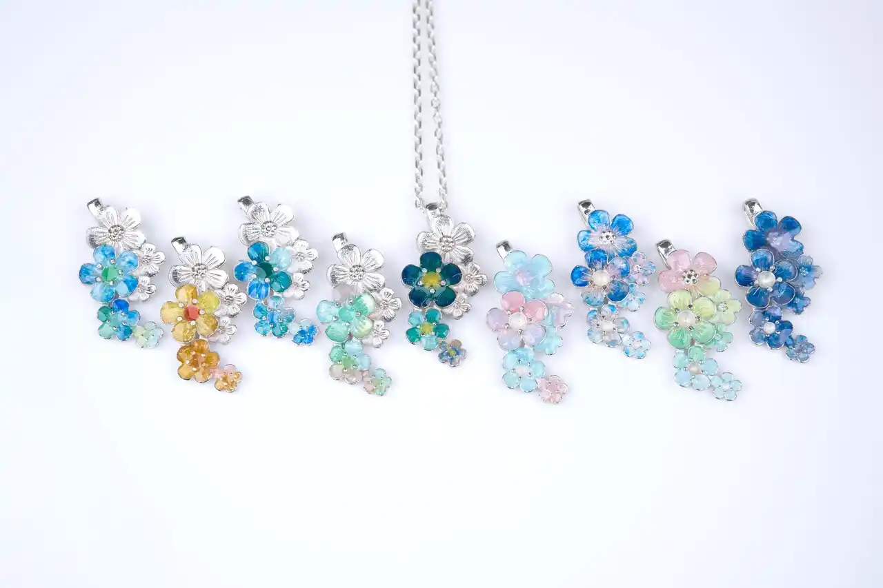 その「エマーユリング」を制作いただいたお客様に当初よりアンケートを実施しておりますがそのアンケートでまた違った色を使って製作したいという希望と、ネックレス(ペンダント)、ピアス、ヘアアクセサリー等をトータルコーディネートしたいというアンケート結果が多く寄せられており、早くからピアス・ネックレスの商品開発を行ってまいりました。 |