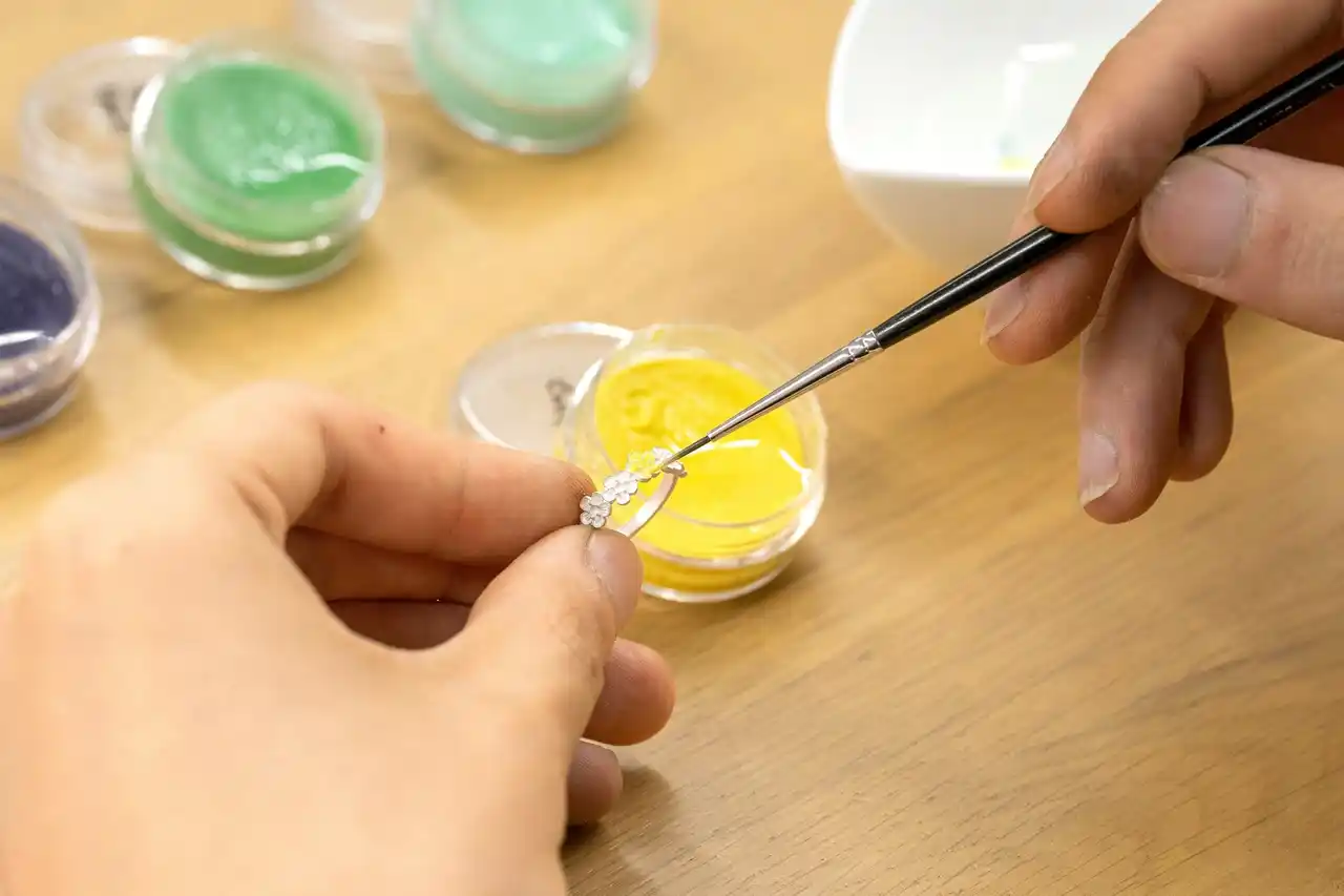 また、エマーユで選べる釉薬(ゆうやく)のカラーも新たに5色が追加され、全13色の色彩豊かなカラーリングで、更に自由で美しく、自分らしいジュエリーをお作りいただけるようになりました。 |