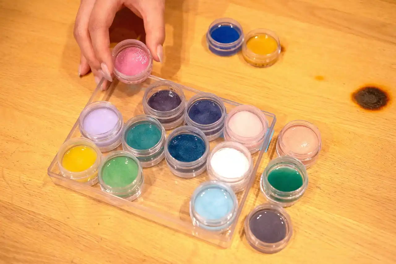 これらの色を工房にて自由にお選びいただき、好きな色の組み合わせを塗っていくことによって、世界で唯一の、自分だけのジュエリーをおつくりいただけます。 |