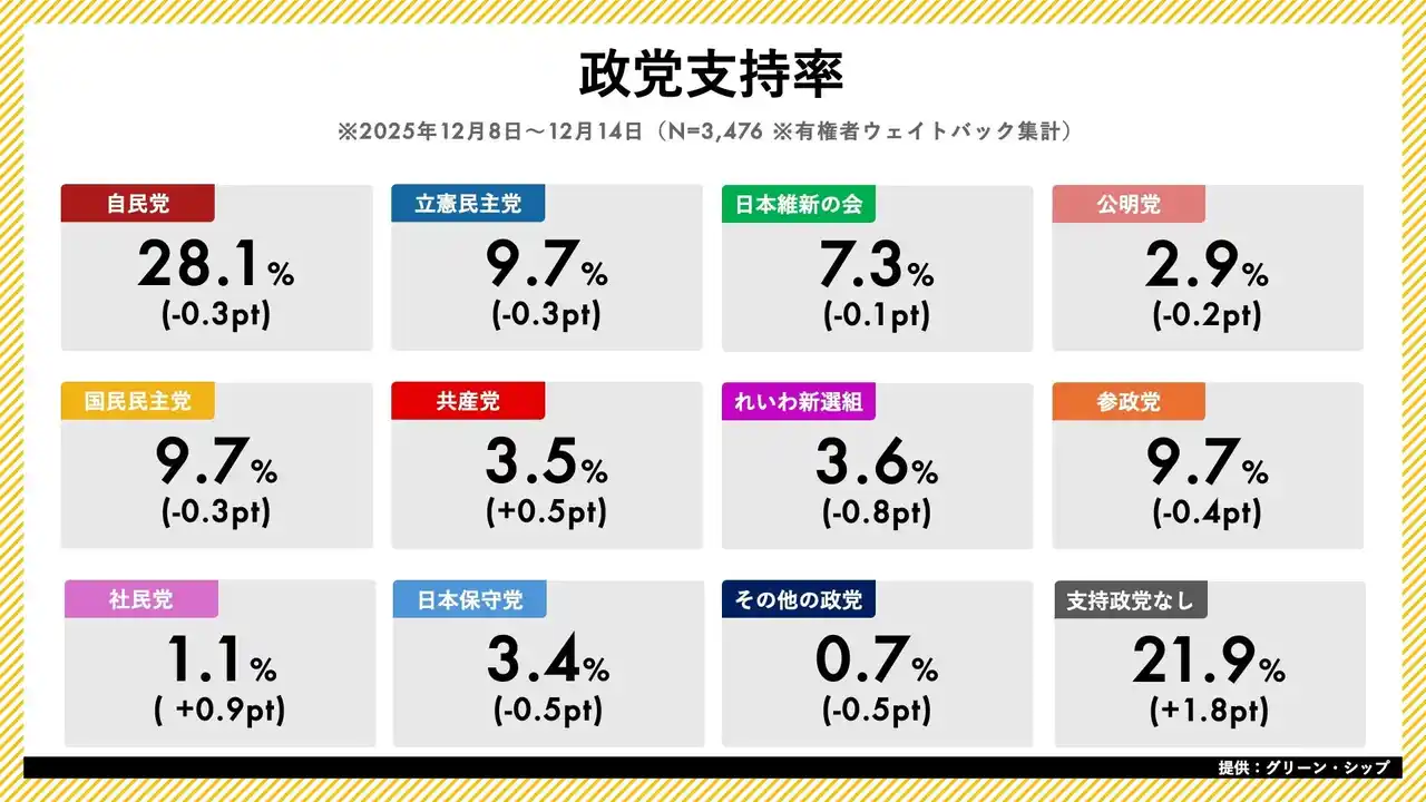 | ジャッグジャパン株式会社(本社:東京都渋谷区)は、株式会社グリーン・シップ(本社:東京都千代田区)と業務提携し、グリーン・シップが提供する日次世論調査「世論レーダー」のデータを提供しております。本日、2025年12月第2週(12月8日~14日)の内閣支持率・政党支持率調査の結果を発表いたします。また、詳細レポートPDFを「世論レーダー」公式サイトの週次ページで1,980円(税込)で販売開始しました。 | |||