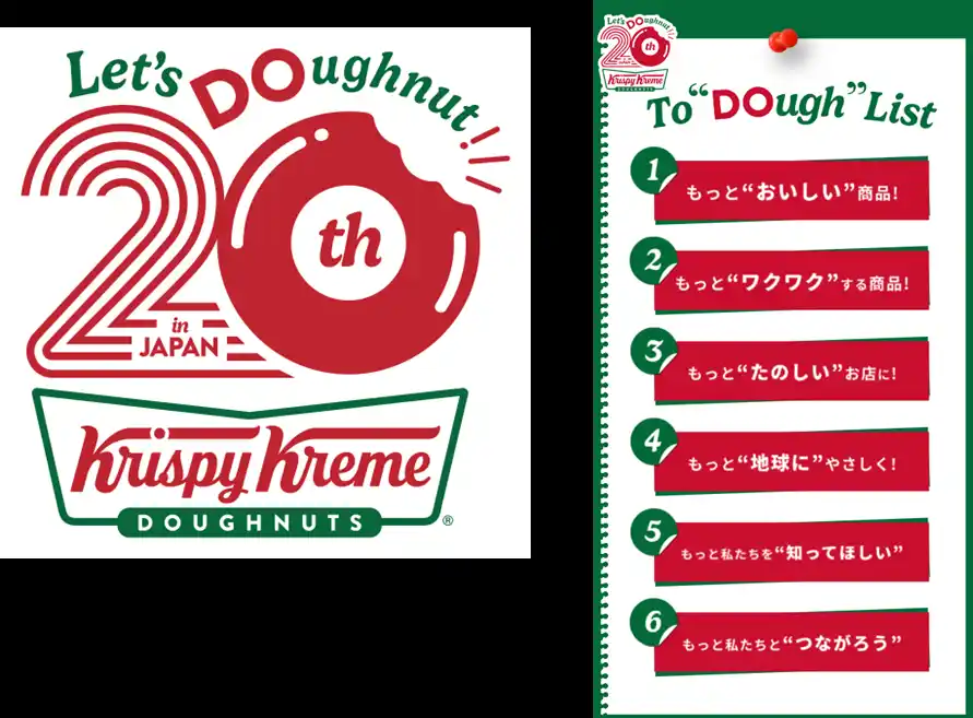 | 日本上陸から満20年を迎える1年間、「Let’s DOughnut!」をテーマに掲げ、これまで支えてくださったお客様だけでなくまだKKDを知らないお客様にも、たくさんのワクワクとJOYをお届けする6つのテーマの「To DOugh List」を作成しました。 | ||||||||||||