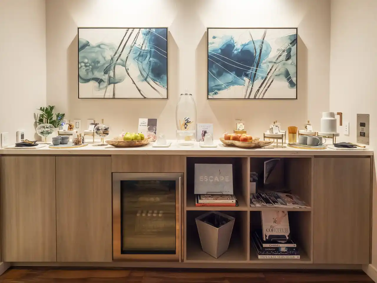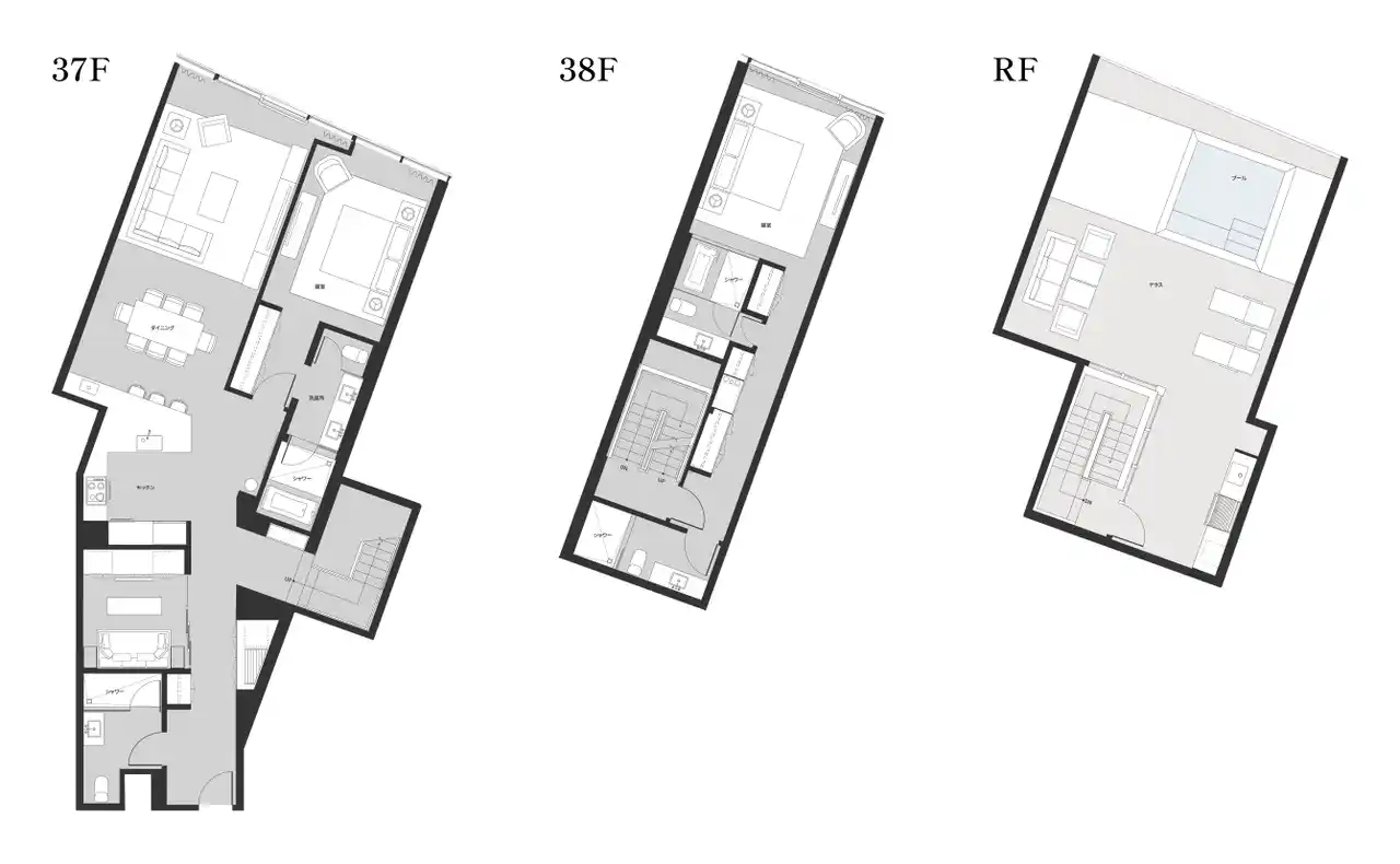 客室は2LDK+DENで構成され、37階にはキッチン、リビングダイニング、マスターベッドルーム、バスルームを、38階にはベッドルームとバスルームを配置。 |