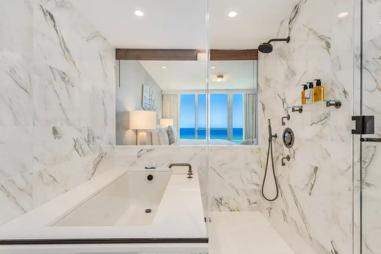 大理石を贅沢に使用したバスルームからは、海景を望みながらゆったりとバスタイムを満喫できます。 |