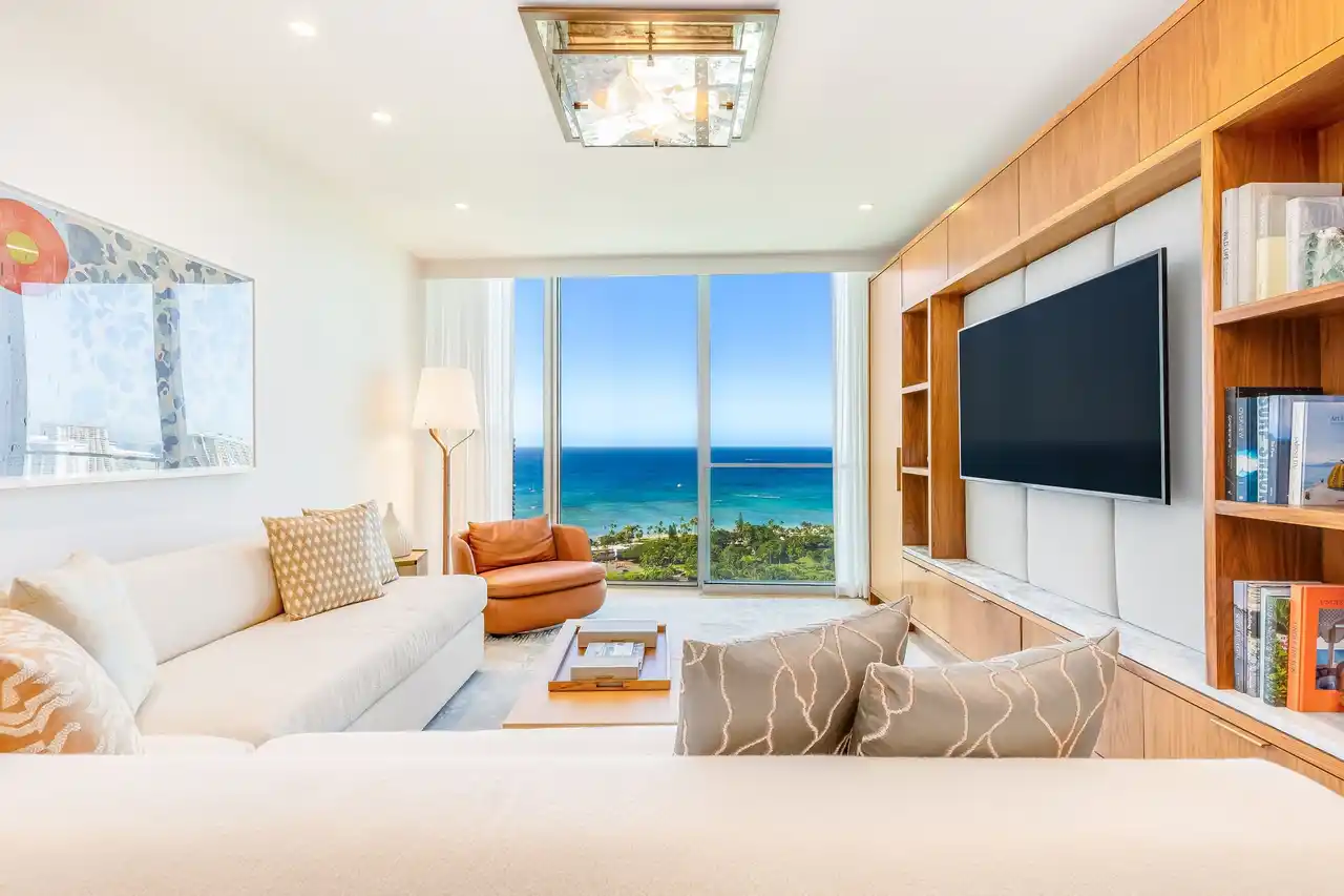 全面の窓から柔らかな日差しが差し込み、ワイキキの美しい海を一望できるリビングルーム。 雄大なパノラマビューに包まれ、まるで自然とつながるような心地よい寛ぎが生まれる、特別なリビング空間です。 |