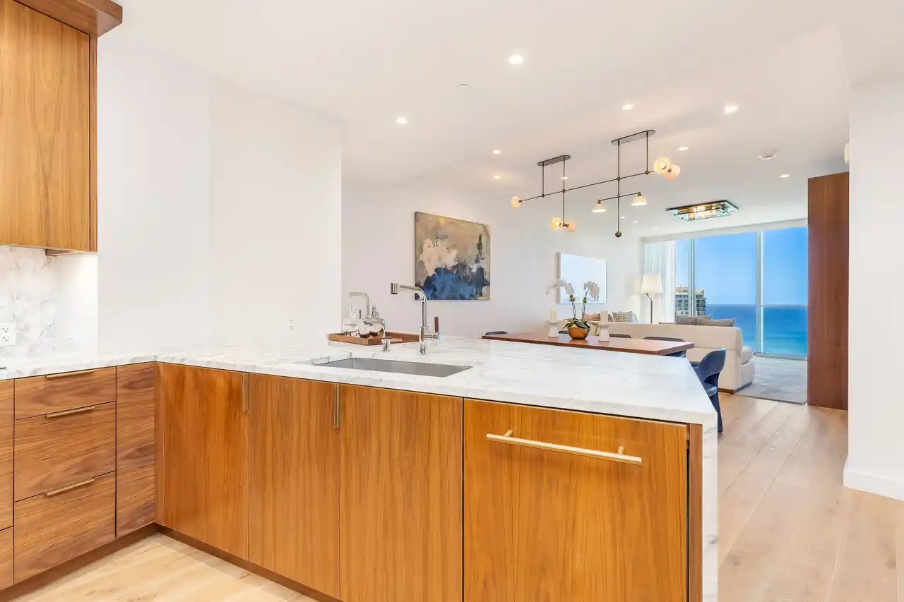 大理石のカウンターとウォールナットのキャビネットが調和した上質なキッチン。 |