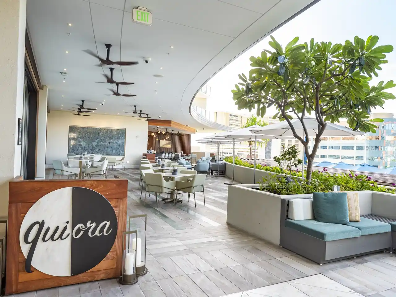 地中海のエッセンスを取り入れたレストラン「Quiora」では、ワイキキの大パノラマを望むオープンエアのダイニングで、厳選素材を活かした料理が楽しめます。ハワイの風とともに、洗練された食体験が広がります。 |