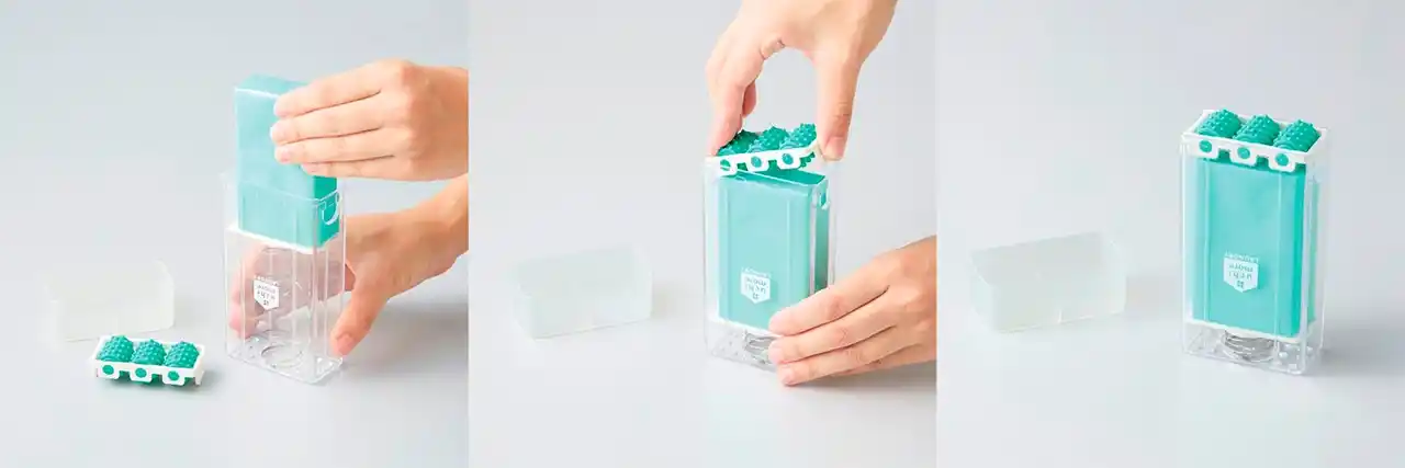 せっけんを押し入れながら、ローラーの留め具を片方ずつ入れます。最後にローラー面をカチッと音がするまで下に押し入れてセット完了。 |